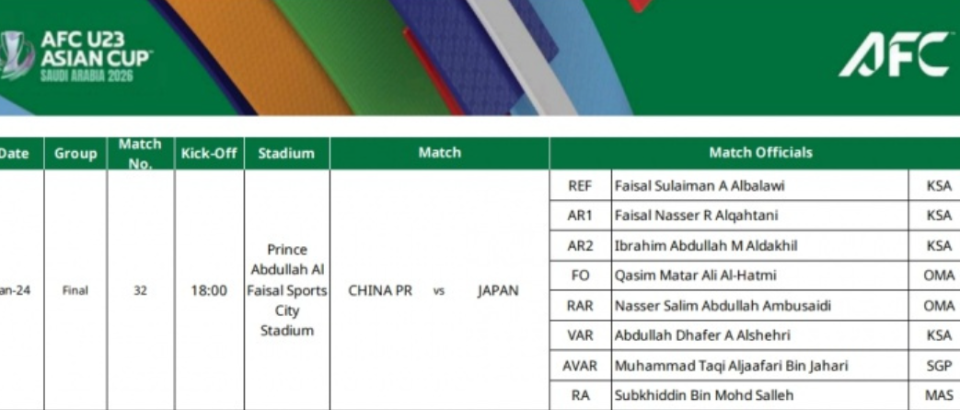 1月23日,亚足联官方渠道发布了U23亚洲杯的比赛安排。沙特主裁判费萨尔-苏莱曼-A-阿尔巴拉维将执法本场比赛,第一和第二助理裁判同样来自沙特,第四官员则来自阿曼。这就意味着,届时中国U23国足又将面临西亚裁判组的执法,但愿这不会对比赛造成消极的影响。